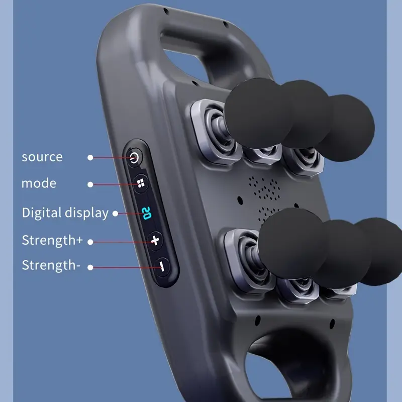 Шестглавият дълбокотъканен масажор е иновативно устройство, предназначено за облекчаване на мускулни болки, намаляване на напрежението и подобряване на кръвообращението чрез интензивен и целенасочен масаж. Устройството е оборудвано с мощна акумулаторна батерия, която осигурява дълготрайна употреба и висока производителност.